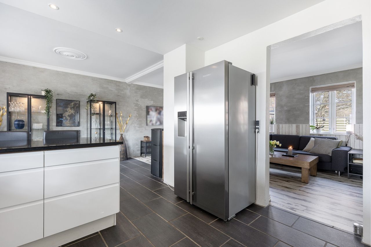 Hoveddøren slår op til 122 flotte kvadratmeter. I stueetagen strækker planløsningen sig over en rummelig