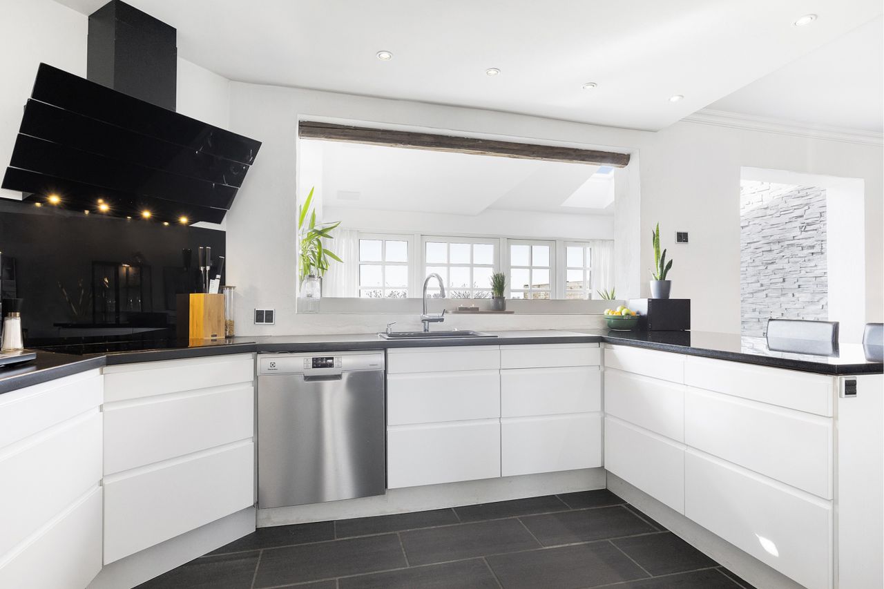 loftsbjælkerne titter frem i det strømlinede, hvide køkken, eller hvordan trappens originale strukturer giver