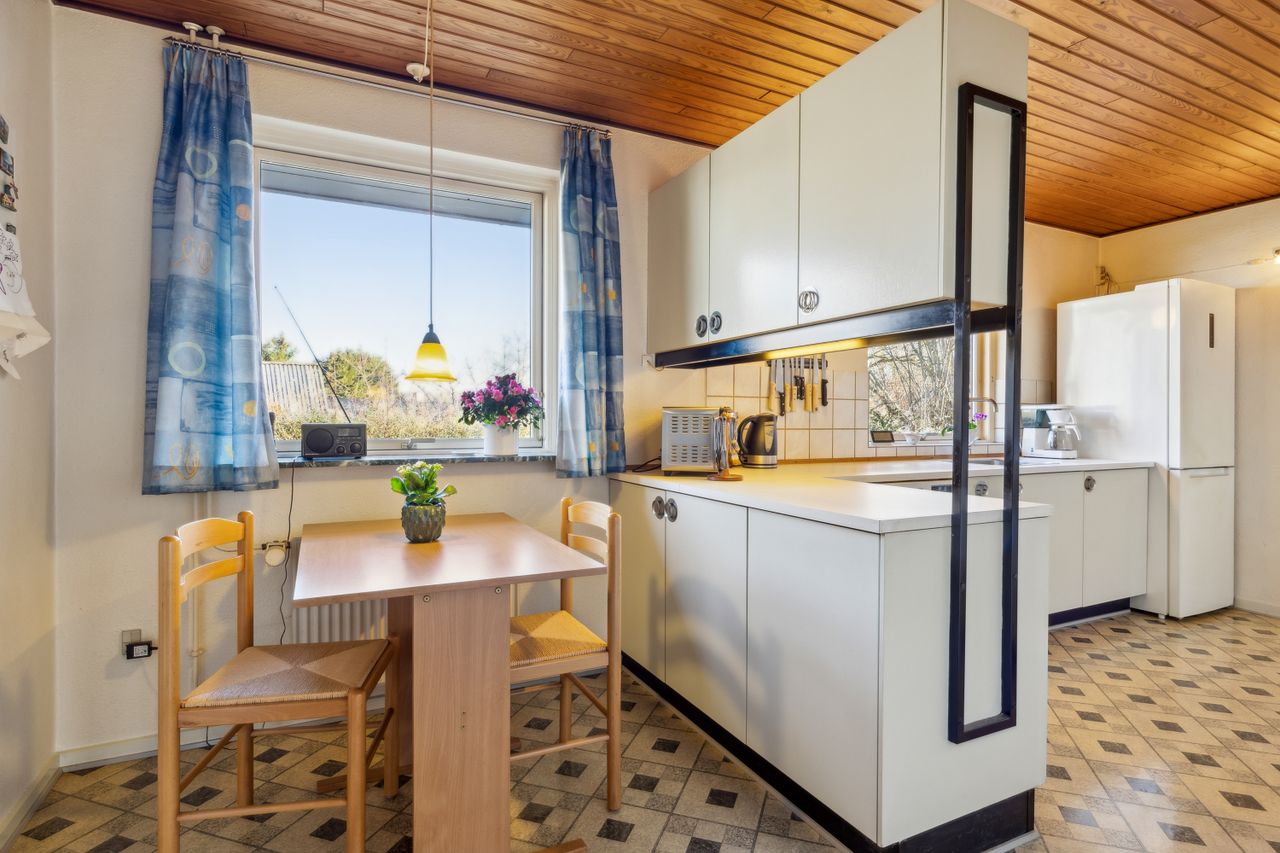 Indenfor venter 112 kvm fordelt over en praktisk planløsning. I får en rummelig entré, et bryggers, et flot flisebadeværelse, et køkken med spisekrog, en lysfyldt stue og tre gode værelser.