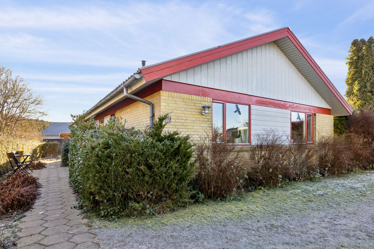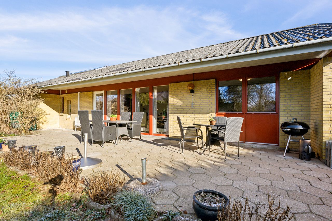 Selve huset er fra 1977, opført i gule mursten. Til boligen hører både carport, udhus, stort værksted, en hyggelig have og en stor, sydvendt terrasse. Dette bliver et fast solspot til eftermiddagskaffe og grillhygge.
