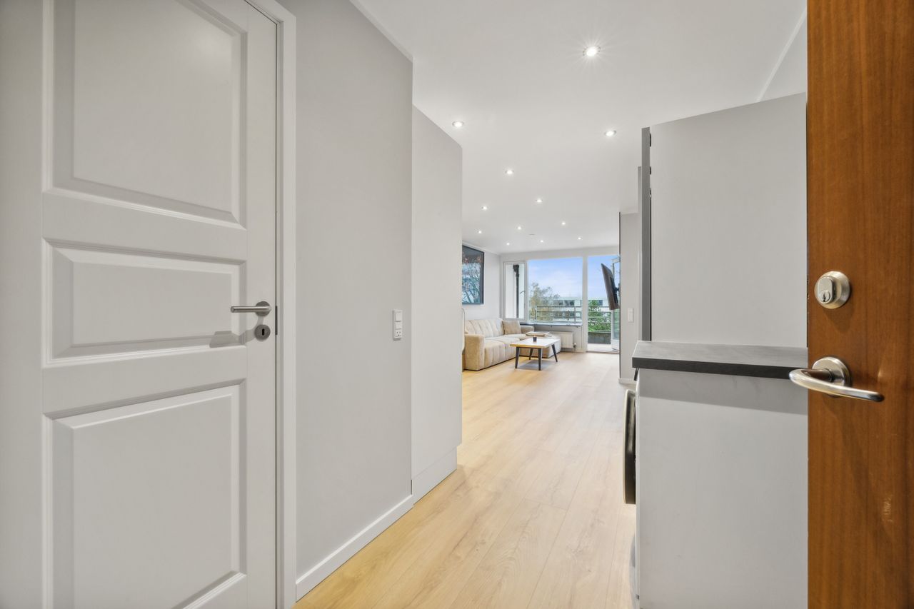 Indvendigt mødes du af et stilrent hjem renoveret i 2023. De 48 m² er gennemtænkte og klar til indflytning. Fra entréen træder du ind i en bolig med flotte gulve og moderne detaljer som spots i loftet og mulighed for etablering af vaskemaskine. Badeværelset har rainshower, væghængt toilet og lyse fliser, mens køkkenet smelter flot sammen med stuen og alrummet – ideelt til både hverdag og gæster. Det regulære værelse har en skøn udsigt til grønne omgivelser.