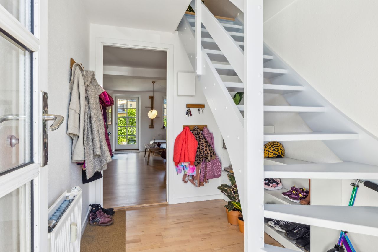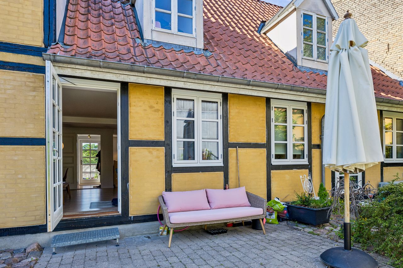 Fra køkken-alrummet kan du træde ud i gårdhaven på dit eget sydvendte terrassestykke med blomsterbed; her på terrassen er der dejligt stille – også selvom du bosætter dig midt i byen. Din adresse ligger nemlig centralt i Næstved, lige ud til Rådmandshaven og Slusehuset, hvor du kan leje kanoer og spise is, når sommeren kommer. Du er kun få skridt fra indkøb og det gode café- og butiksliv ved Axeltorv. Og med din nye adresse kan du også glæde dig over, at du kommer til at tilhøre skoledistriktet for den virkelig gode Lille Næstved Skole.