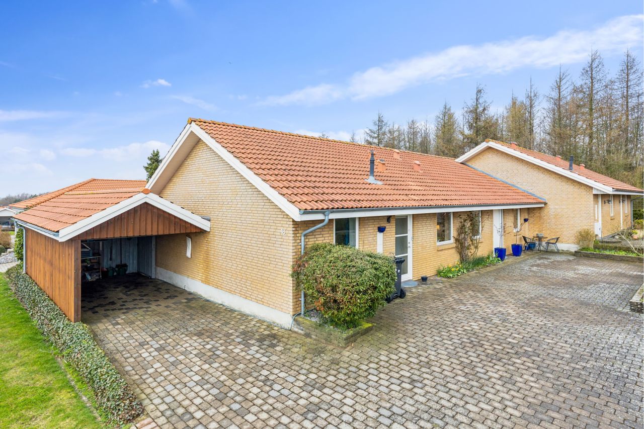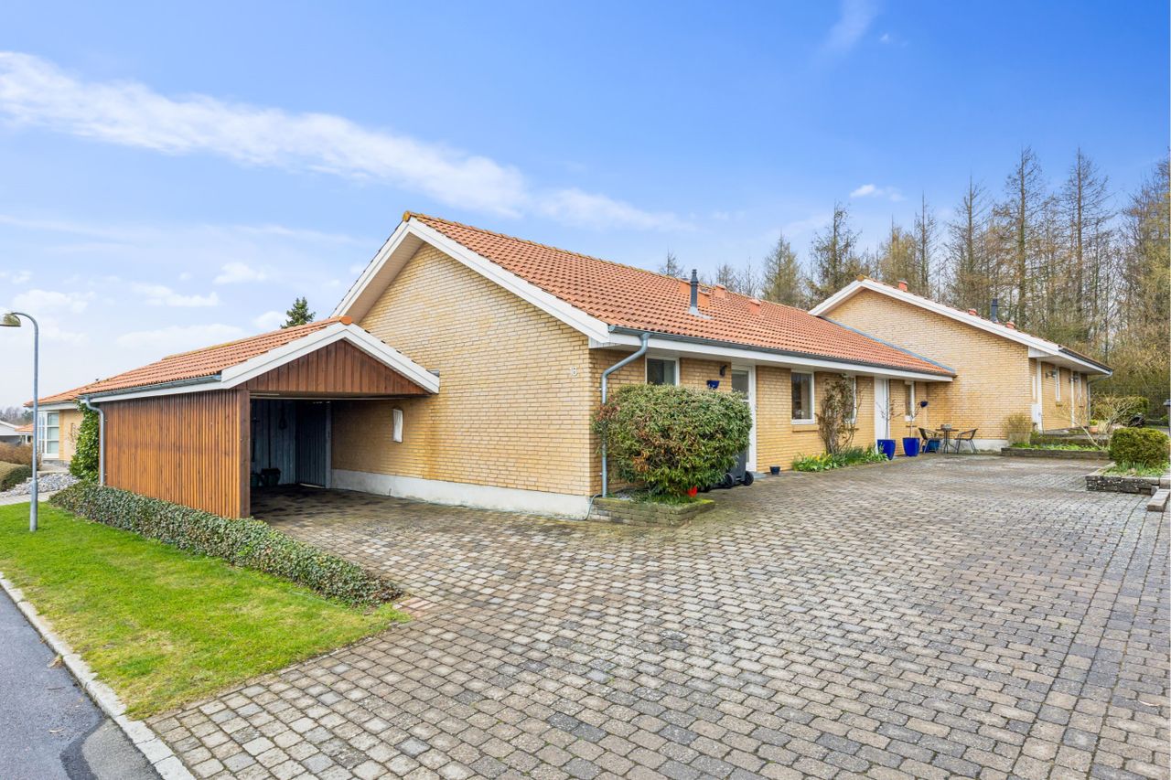 store carport kan bilen parkeres, ligesom vasketøjet kan tørres. Den dejlige have er velanlagt og nem at