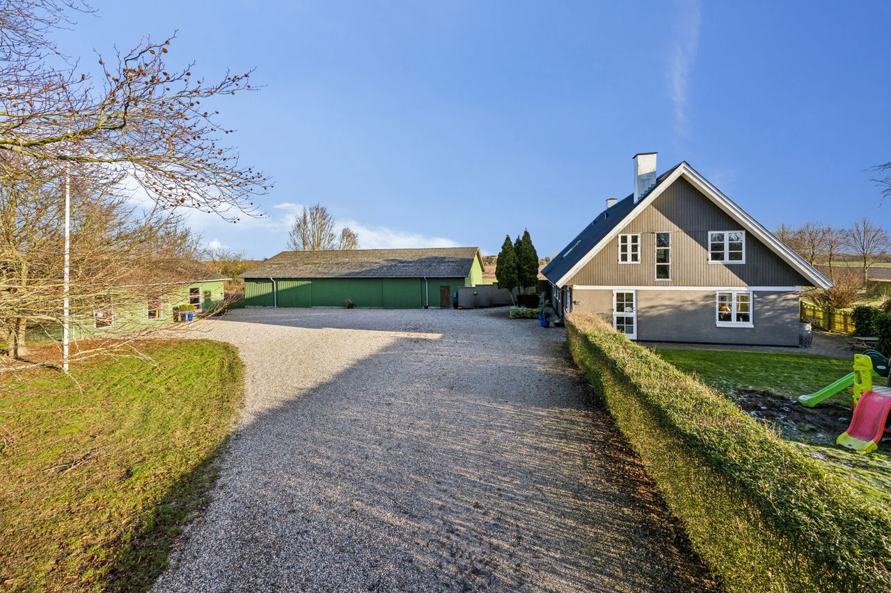 Mulighederne står i kø herhjemme og med stald, hal og festsal kan I både have heste, drive erhverv hjemmefra og huse de helt store fester, f.eks. driver sælger en privat dagpleje. Der kan være fold udenfor, eller måske I har andre idéer? Ja, det er næsten kun fantasien, der sætter grænser, for plads er der nok af inde som ude. Der er også mulighed for en indtægt idet bortforpagtningen af de 9,5 hektar landbrugsjord kan fortsættes. Selve stuehuset er væsentligt nyere end de fleste gårde i området, idet det kun har stået her siden 1976 og præsenterer sig i dag rigtig fint og velholdt – vi kan bl.a. nævne, at taget blev malet og renset i 2024.