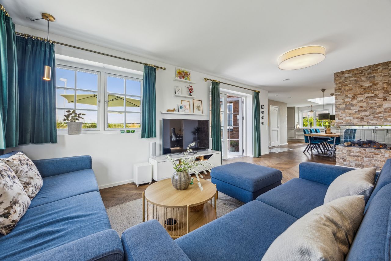 Villaens 203 kvadratmeter fordeler sig derudover på entre med adgang til bryggers, en masterbedroom afdeling hvor badeværelset er med spafølelse. I den anden del af huset findes husets 3 øvrige værelser, et badeværelse og et aktivitetsrum. Fra alrummet føres man ned i den store lystfulde stue, med adgang til kontor og ud til den store sydvendte og solrige terresse. Fra terrassen er der en nem og overskuelige have med kig til marker, sø og udsyn til smukke solnedgange.