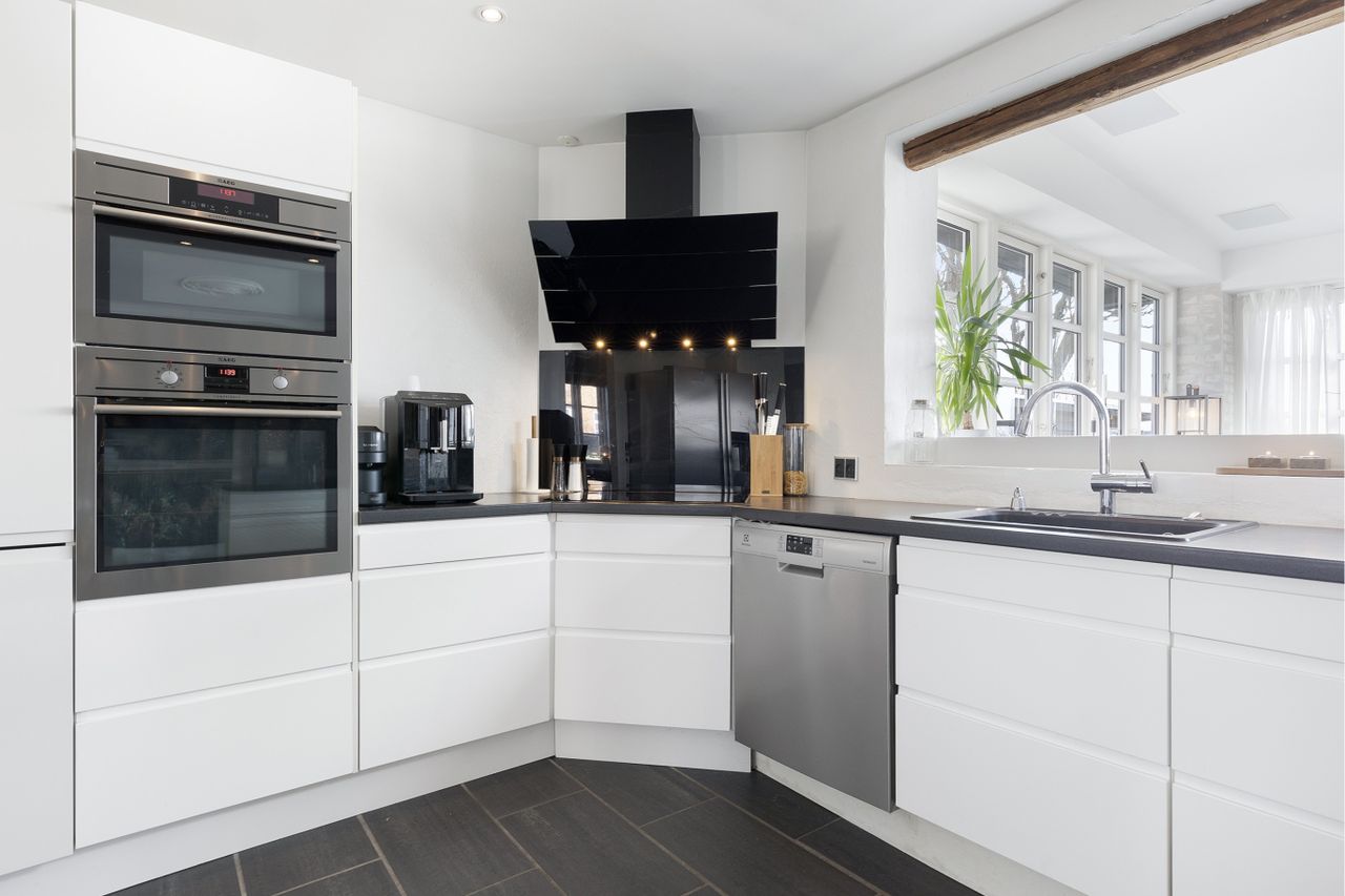 loftsbjælkerne titter frem i det strømlinede, hvide køkken, eller hvordan trappens originale strukturer giver