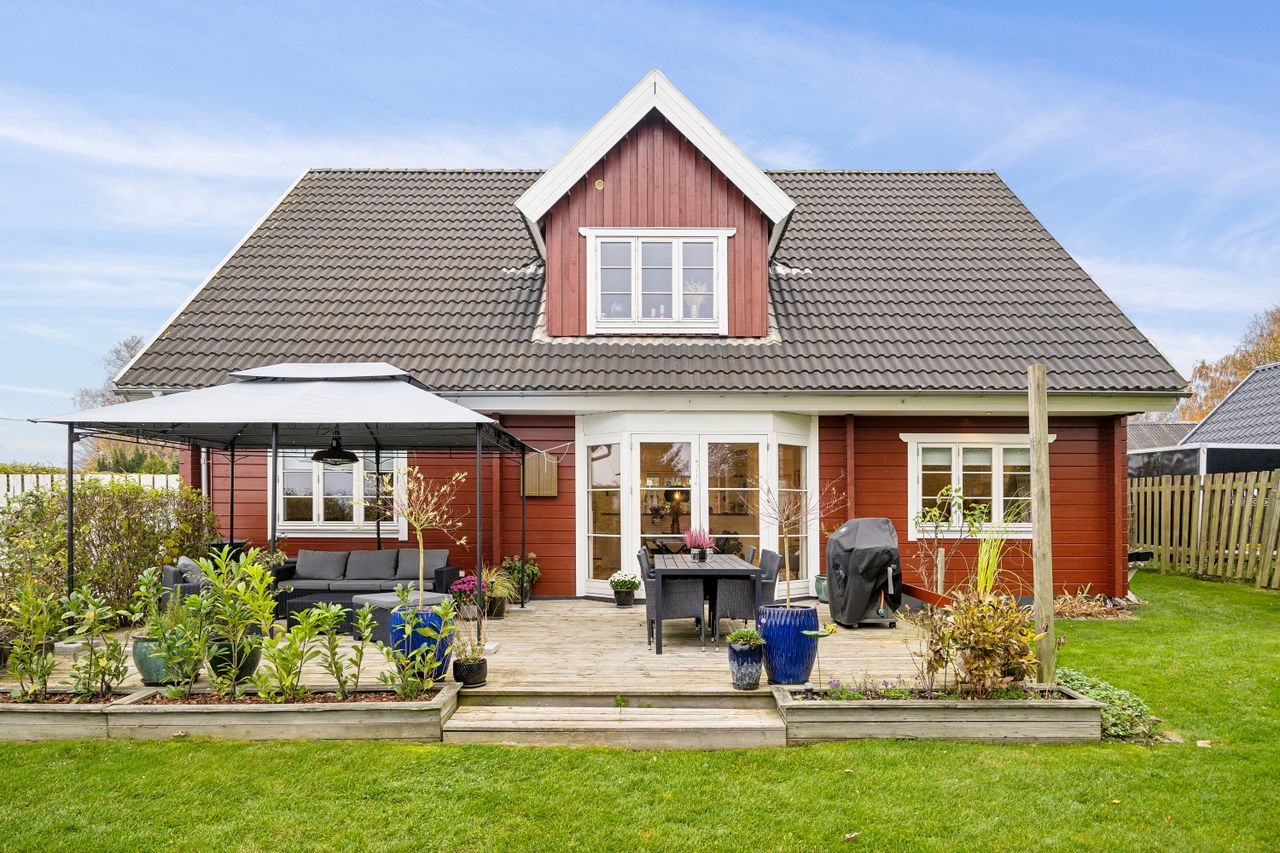 Udendørs råder grunden over et skur og en aflukket have med både et drivhus og en græsplæne med plads til leg, men som særligt skal fremhæves for den solfyldte træterrasse!