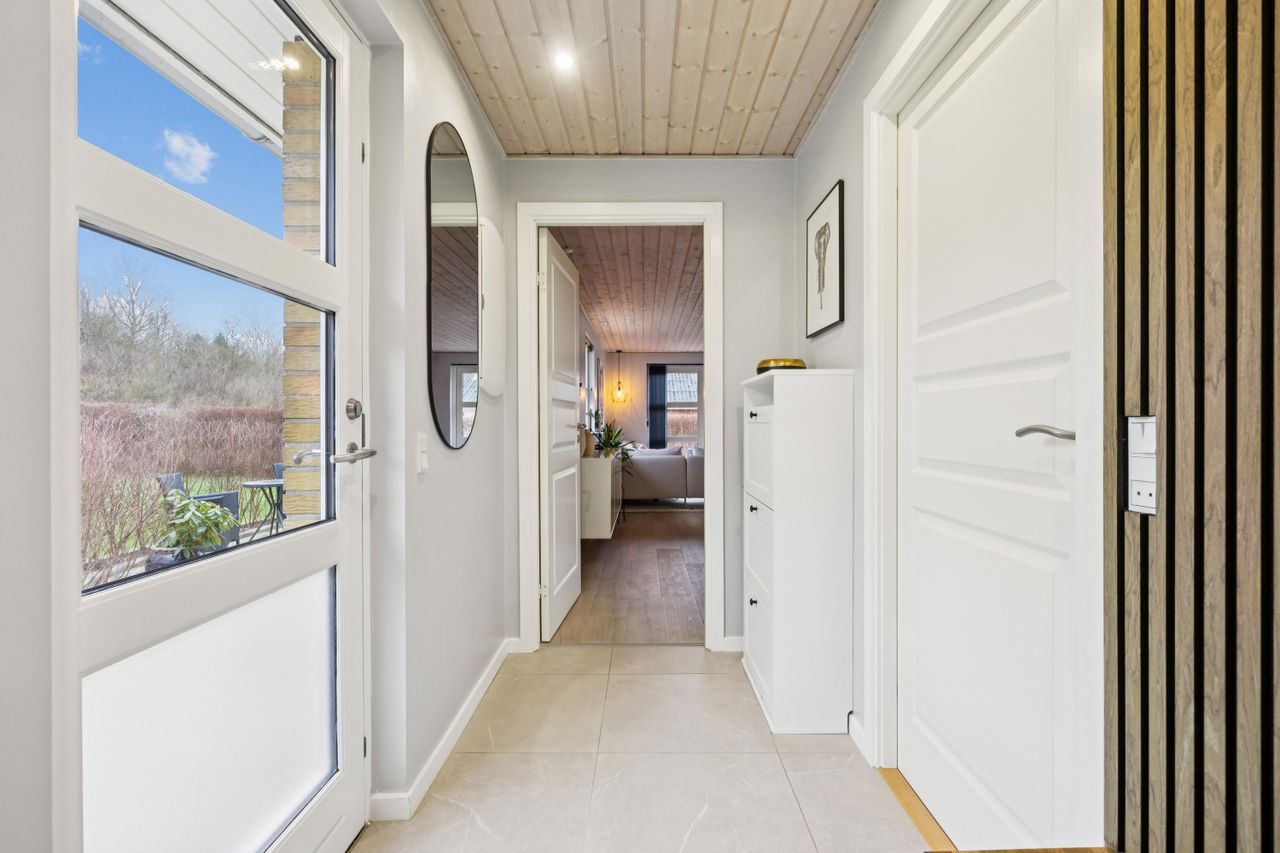 På en lukket villavej i Gelsted ligger en nydelig etplansvilla og venter på sin nye familie. For få år siden blev den opdateret på flere fronter, hvorfor der er gjort klar til, at nøglerne kan skifte hænder, og I kan flytte direkte ind. En pæn forhave, gule mursten, hvide vinduesrammer og et nyt tag fra 2024 møder jer, som I triller ind på adressen. Ja, der er unægteligt styr på det ydre – og det samme gælder indenfor. Bilen kan I parkere i garagen, før I med fordel tager et kig på baghaven. Den er grøn, nem at holde og med fliseterrasser i flere retninger, så I altid kan fange solen. Et udhus tager sig af haveredskaber, krukker og alt det praktiske. Indenfor venter 109 veludnyttede m2: Entréen fik nye fliser i 2024, og samme år blev der lagt nye gulve i hele huset, ligesom døre og karme blev udskiftet. Planløsningen fordeler tre regulære værelser, et brusebadeværelse – også fra 2024 – med gulvvarme samt et åbent opholdsrum, hvor køkken, spisestue og stue glider sammen. Her står en pilleovn, som har fulgt hjemmet de sidste fire år, suppleret af en luft-til-luft varmepumpe fra fem år siden. Bagtil grænser grunden op til et grønt område, og bare 500 meter væk begynder Stenskov med sine stier og udsigter over åbne marker. Svømmehal, idrætsfaciliteter og indkøb nås på cykel, mens skolebussen stopper 100 meter fra hoveddøren. For pendleren er der desuden kort køreafstand til Næstved og Ringsted – og motorvejen ligeså.